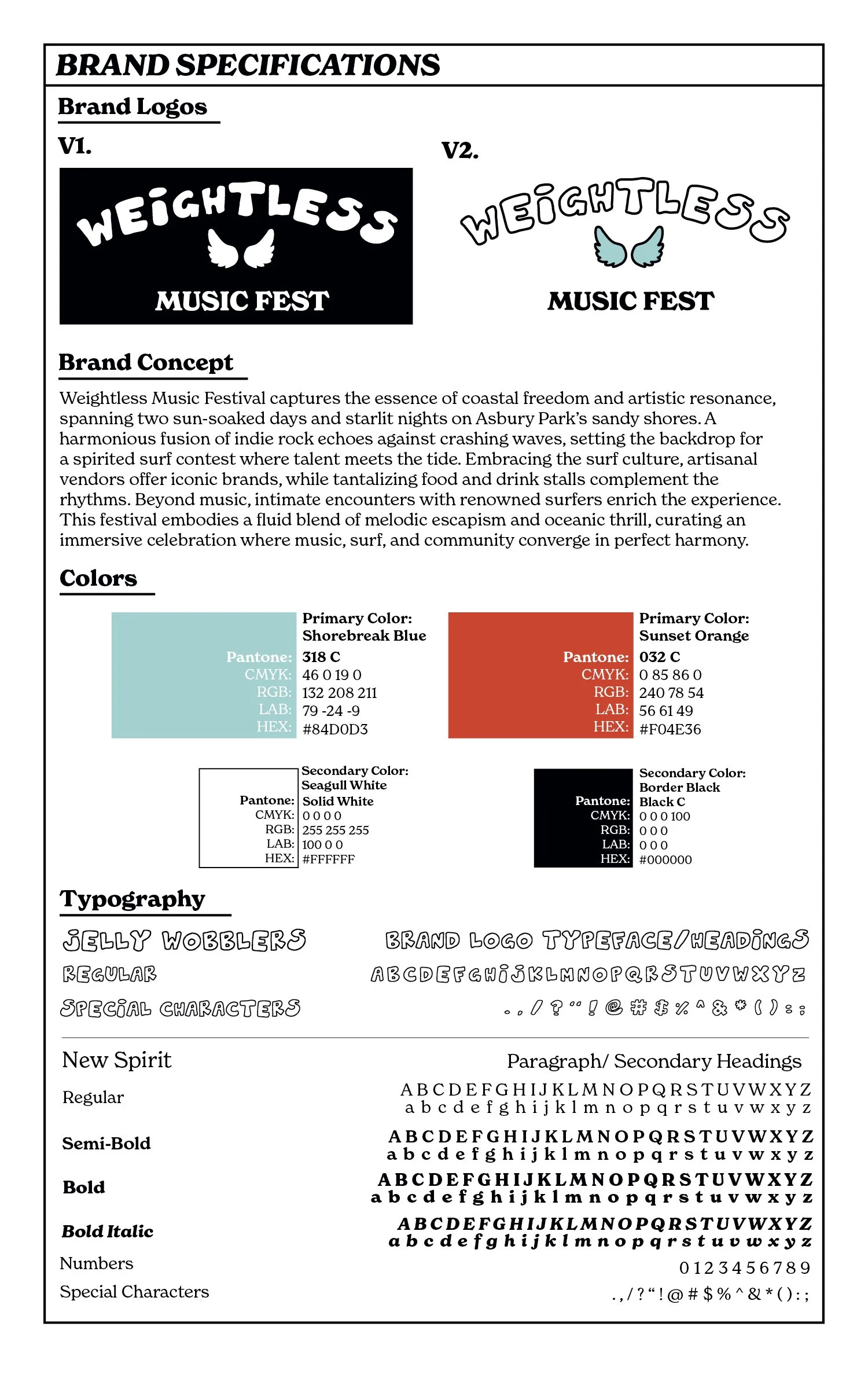 Eight page booklet summarizing Weightless Music Fest’s purpose, branding strategy, and marketing collateral created. Created to serve as a conceptual proposal of the brand to clients. Printed, trimmed and binded in Clemson graphic communications lab.