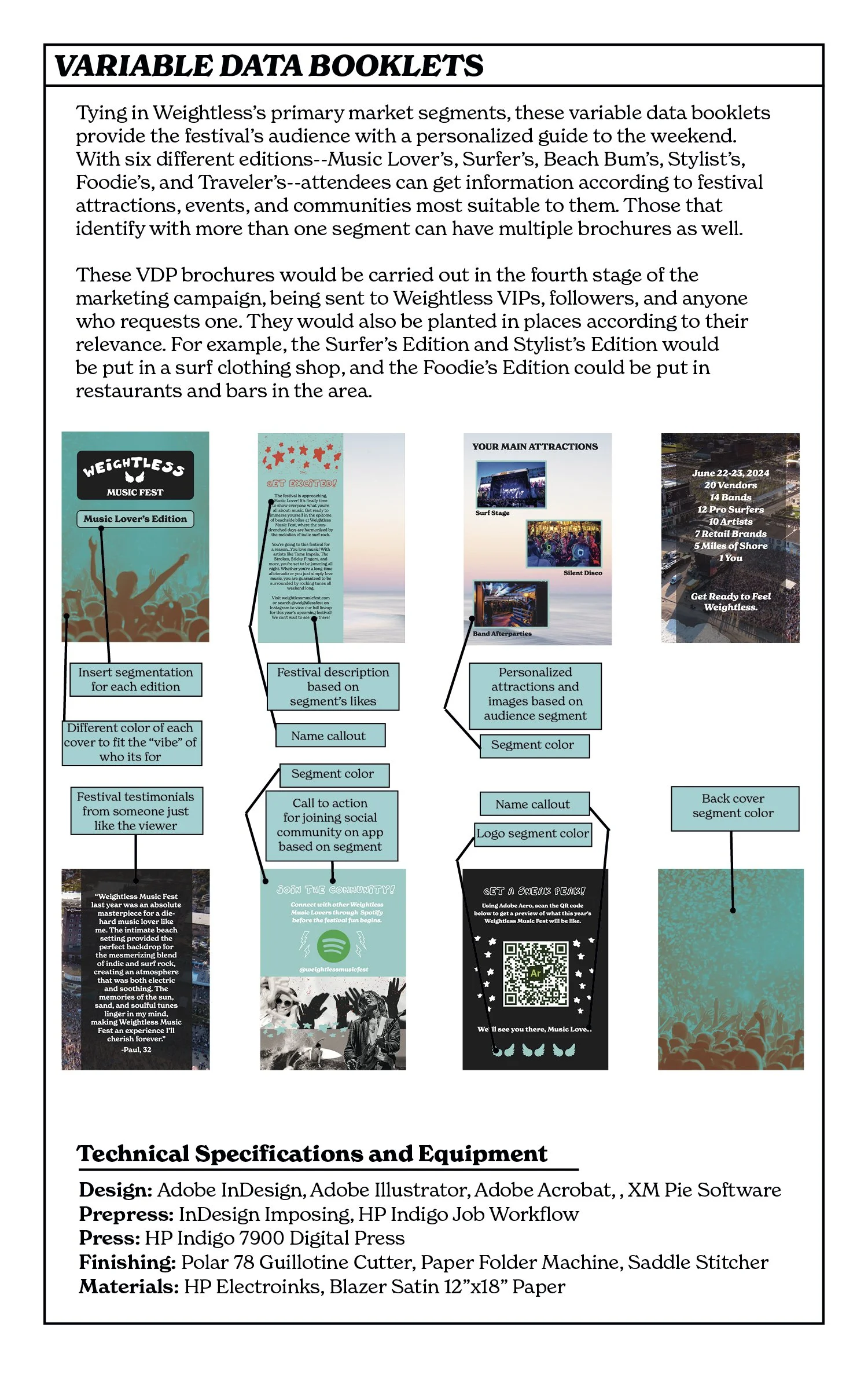 Tying in Weightless’s primary market segments, these variable data booklets provide the festival’s audience with a personalized guide to the weekend. With six different editions--Music Lover’s, Surfer’s, Beach Bum’s, Stylist’s, Foodie’s, and Traveler’s--attendees can access information according to festival attractions, events, and communities most suitable to them. Those that identify with more than one segment are given multiple brochures as well.