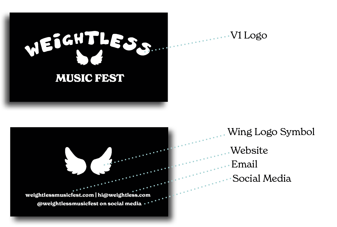 Printed on rich black card stock with pure white text, these business cards are hard to miss. The front of the card contains the Weightless Music Fest Version 1 logo, and the back contains the Weightless website, email, and social media information following the symbolic logo of the wings.