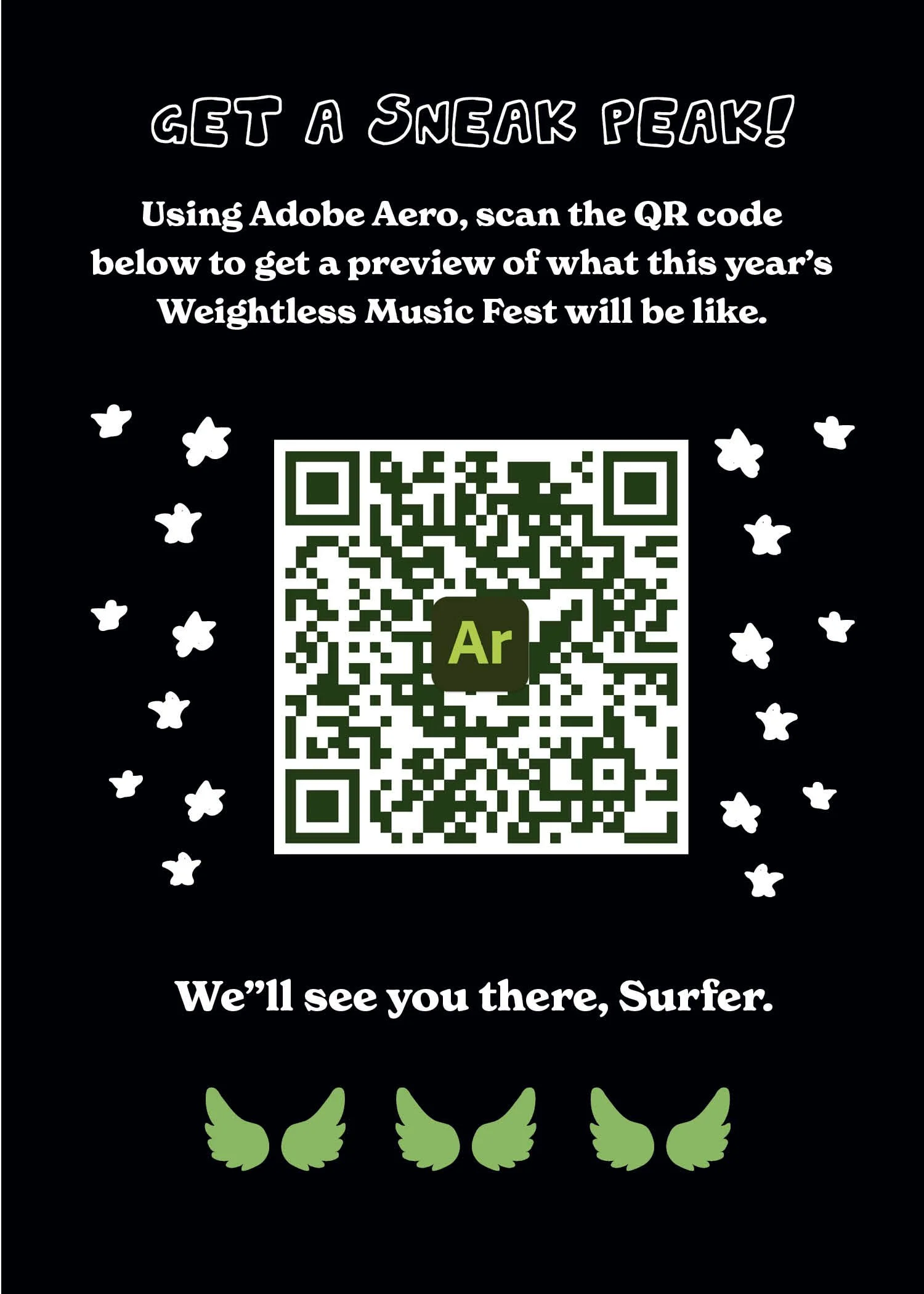Included throughout the marketing campaign, Weightless Music Fest’s augmented reality experiences serve to be truly unique. All viewers have to do is scan a QR code on their phones using Adobe Aero to be unlocked into a virtual world. Appearing first in the static marketing brochure, the augmented reality (AR) experience gives prospective customers a preview of the festival lineup, along with an interactive listen to music that will be played at the festival. The second experience belongs to the variable data booklets, where attendees can then have a preview of all that Weightless has to offer. This experience includes several moving 3D elements as well as a link to Asbury Park’s website, where the viewer can learn more about festival logistics and activities to do when visiting the town for the festival.